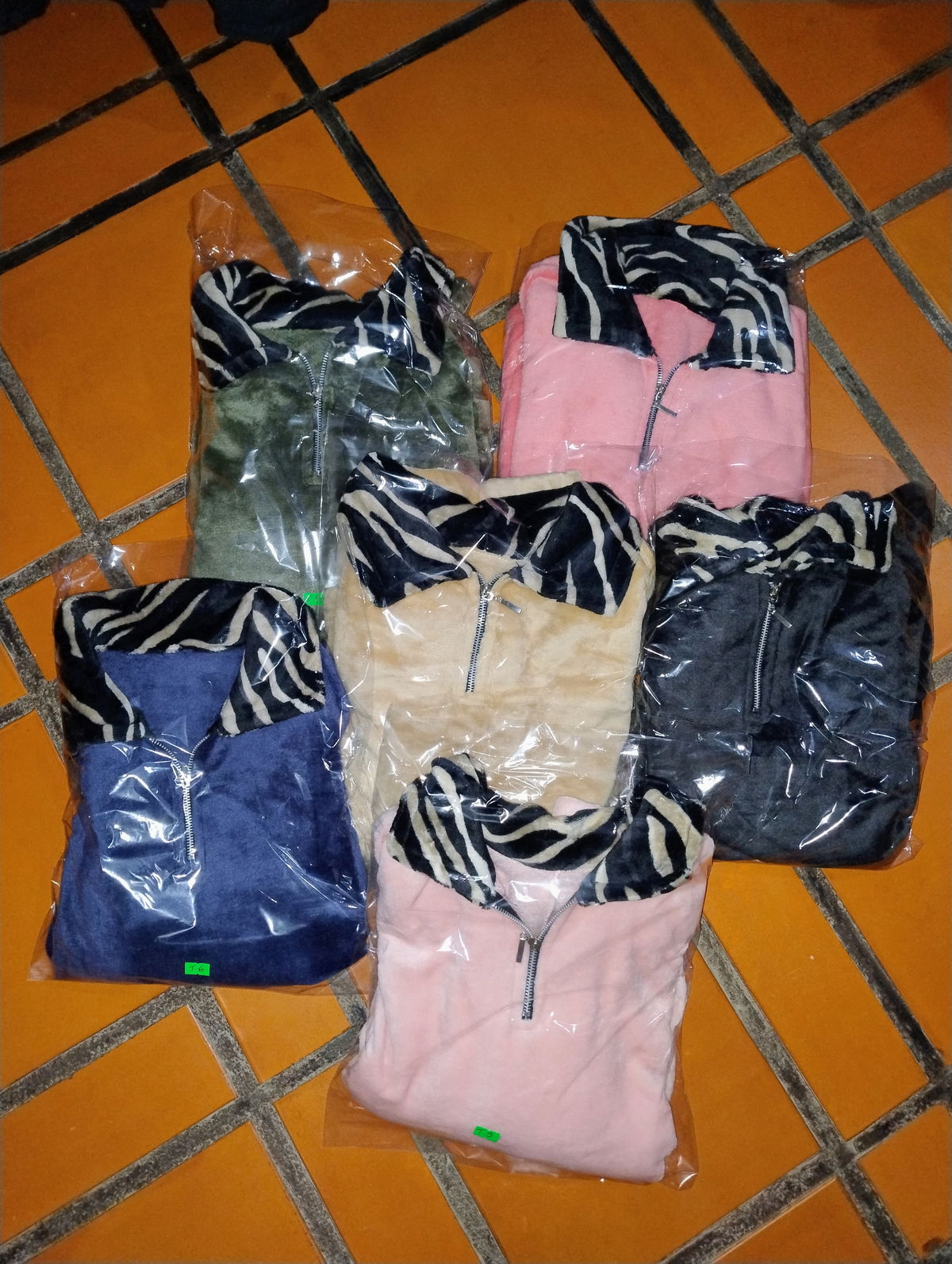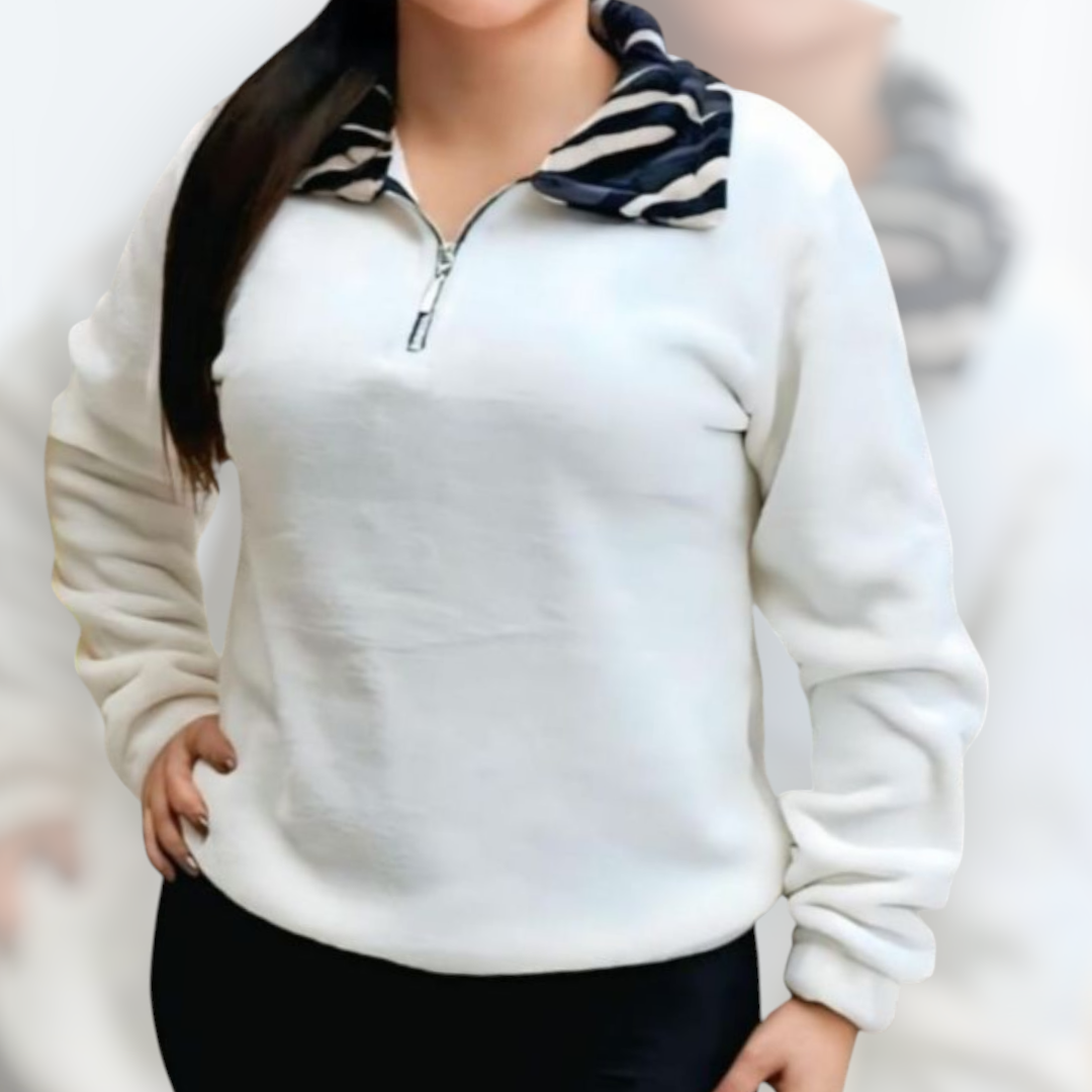 Buzo confeccionado con tela de peluche pelo corto tipo chomba. Con cierre y cuello en cebra.