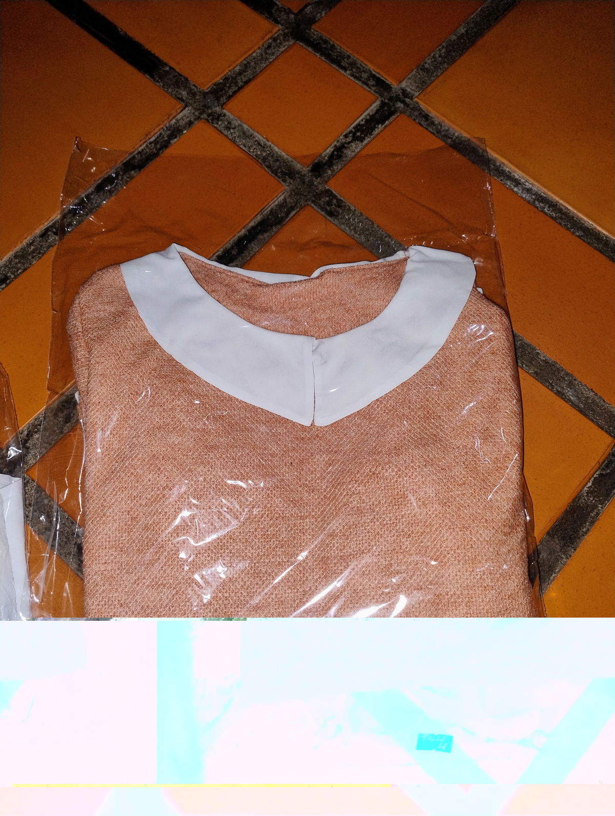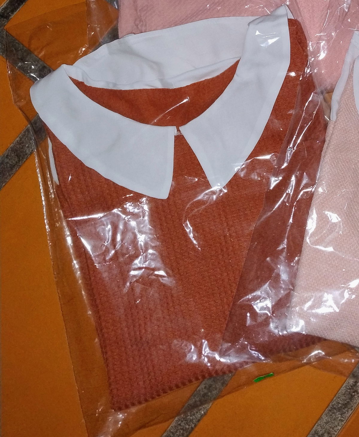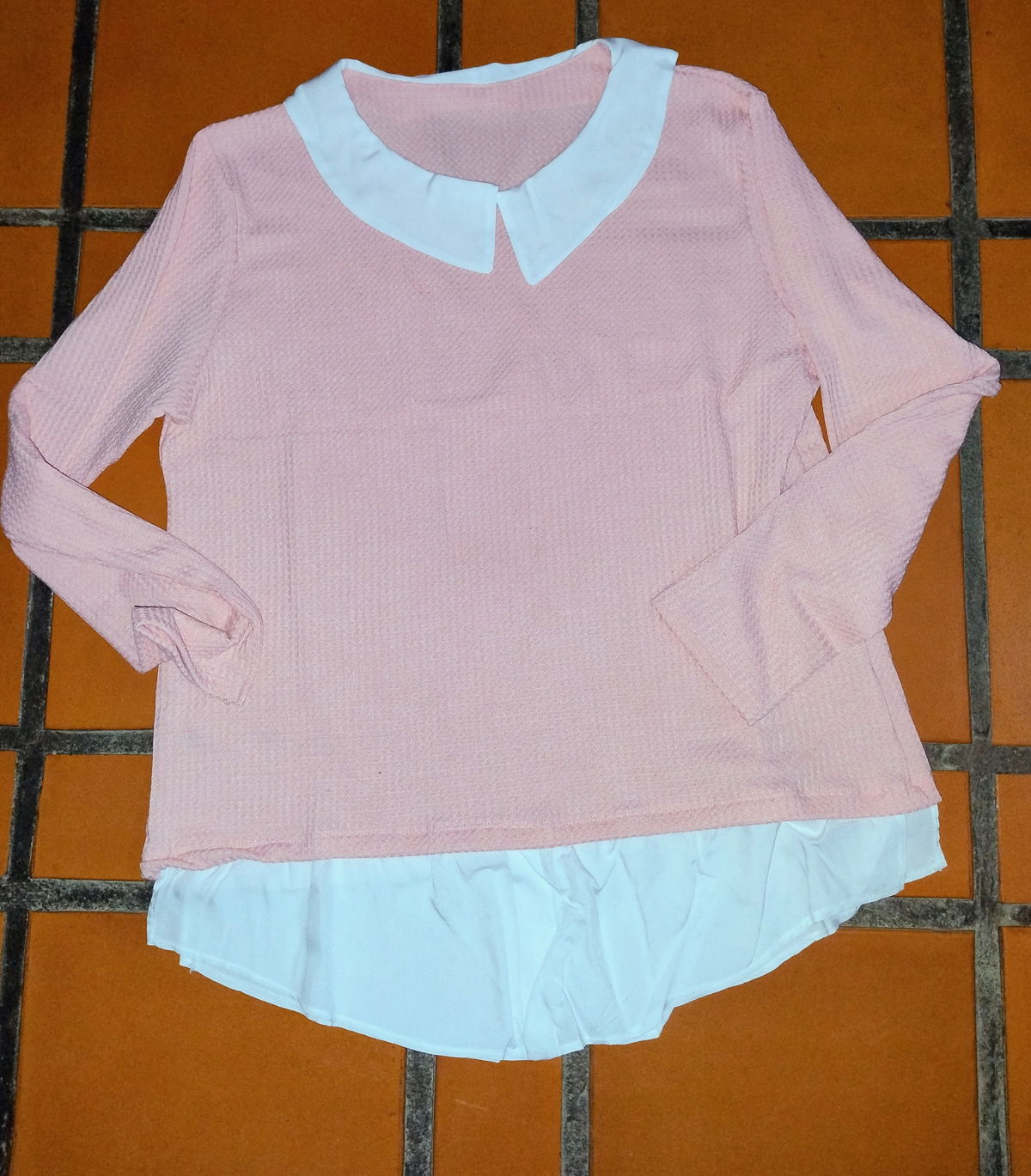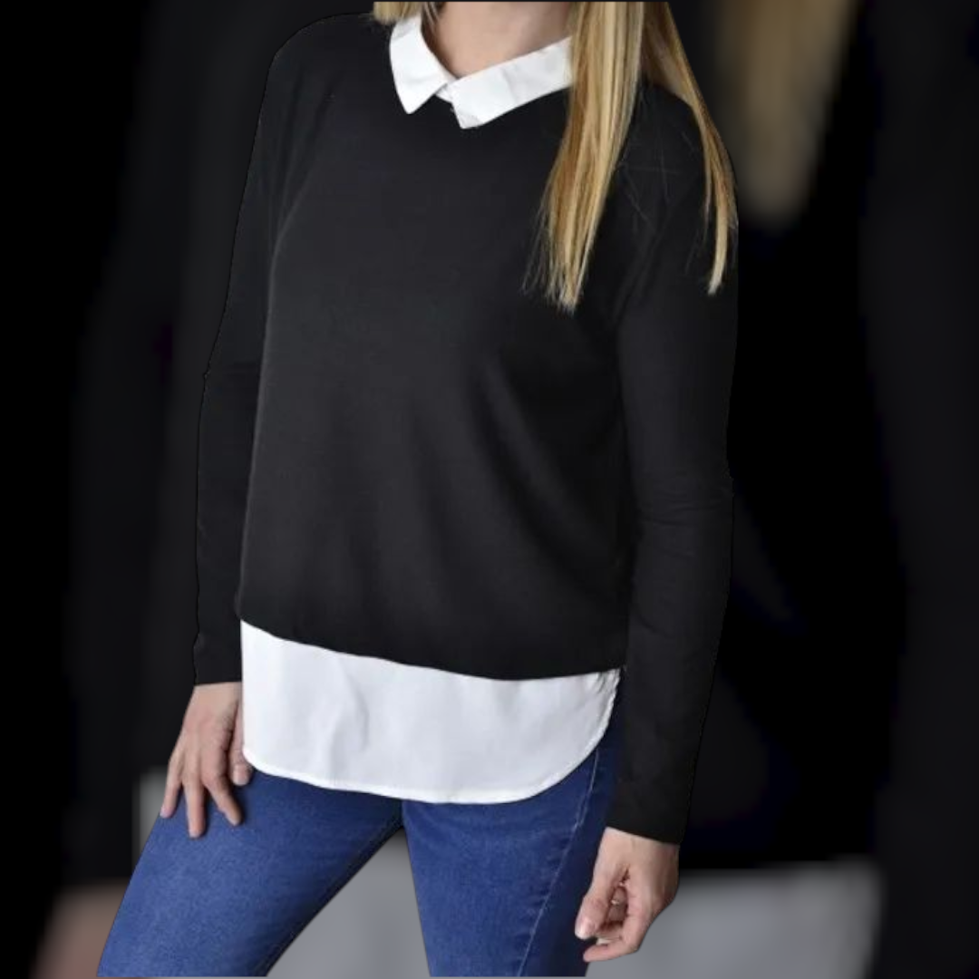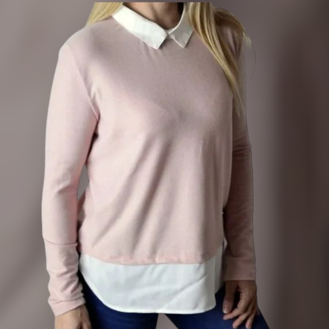 Suéter confeccionado en tela de la anilla con detalles de camisa superpuesta. Es un suéter con cuello y ruedo de camisa.