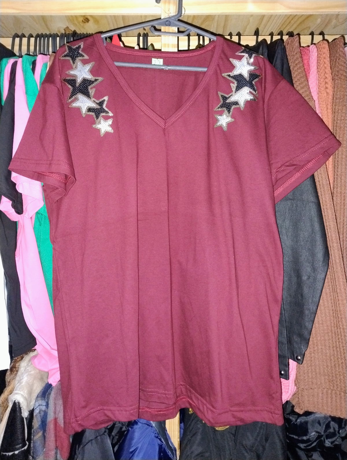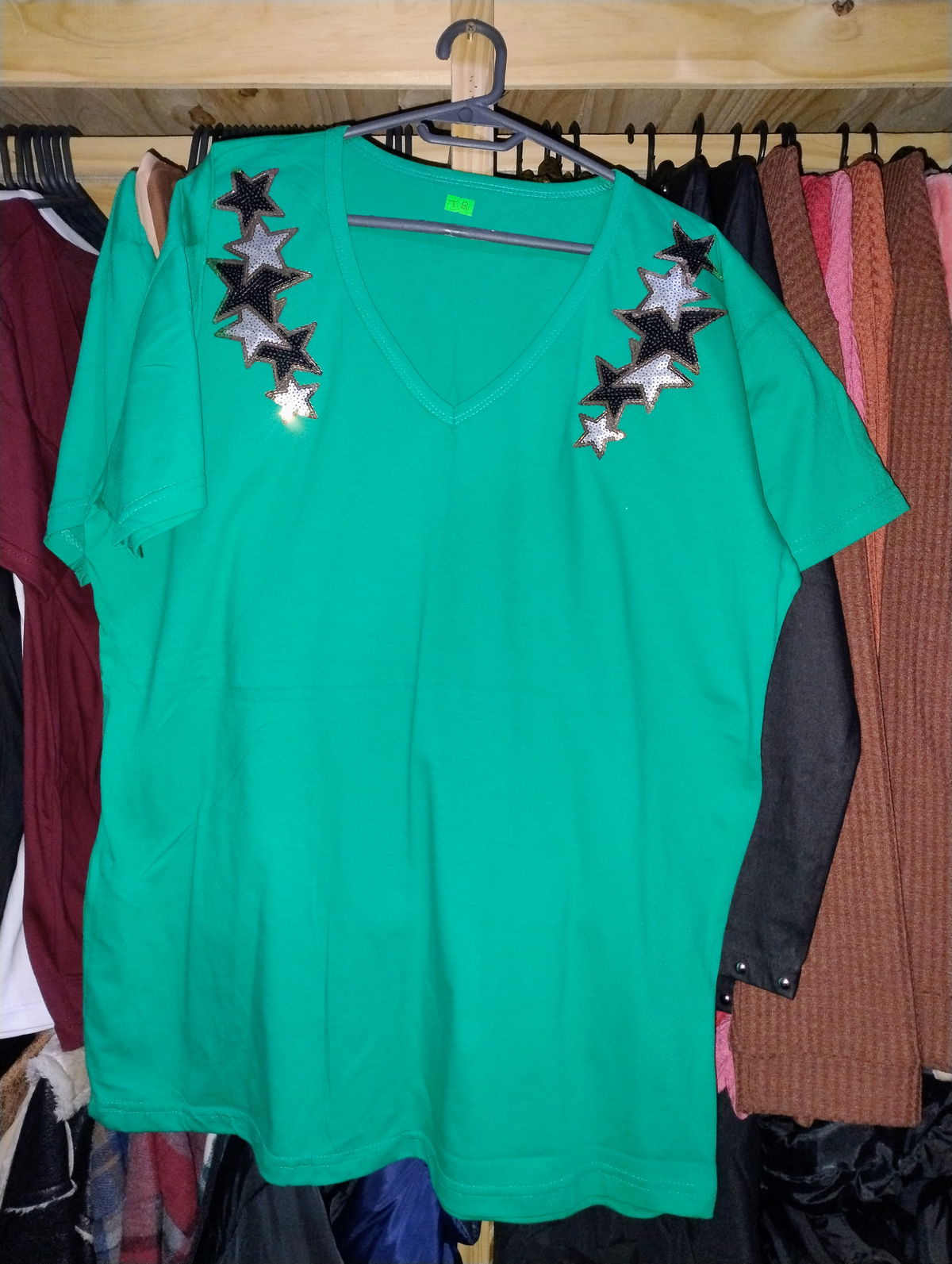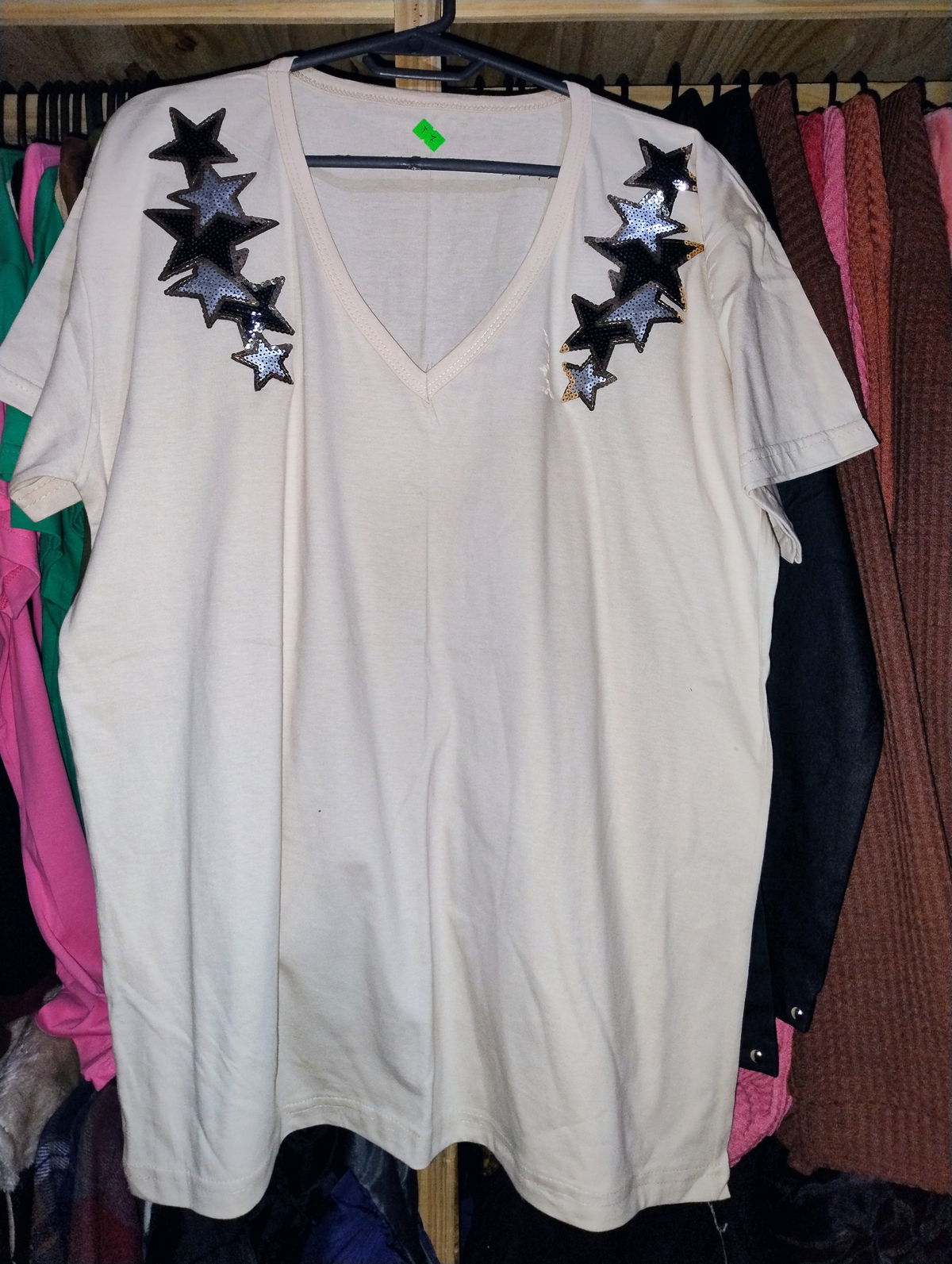 Remera escote en v manga corta confeccionado en tela de algodón con aplique en lentejuelas.
