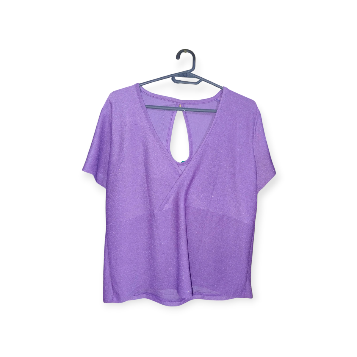 Remera confeccionada en tela con lurex elastizado. tiene escote cruzado y detalle de gota en la espalda.