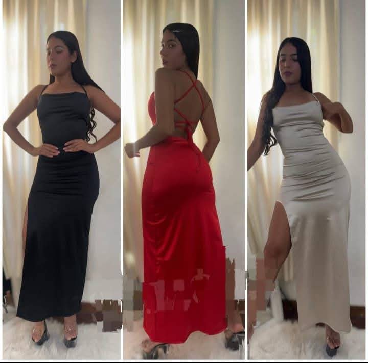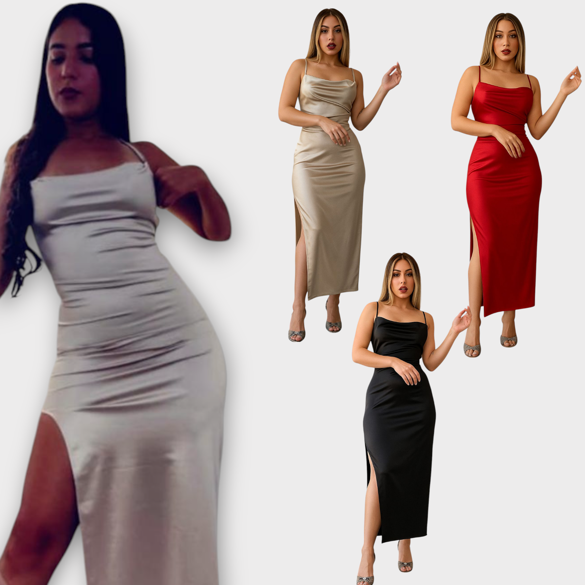 Vestido confeccionado en satélite elastizado con espalda cruzada y Tajo en la pierna.