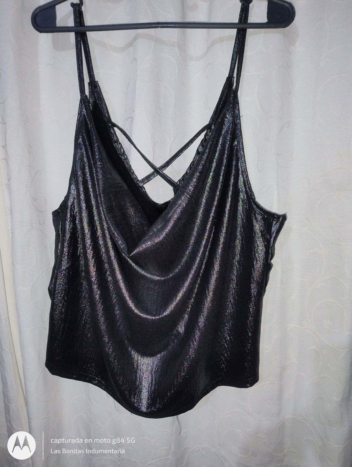 Top confeccionado en tela brillante escote buche y espalda en x.