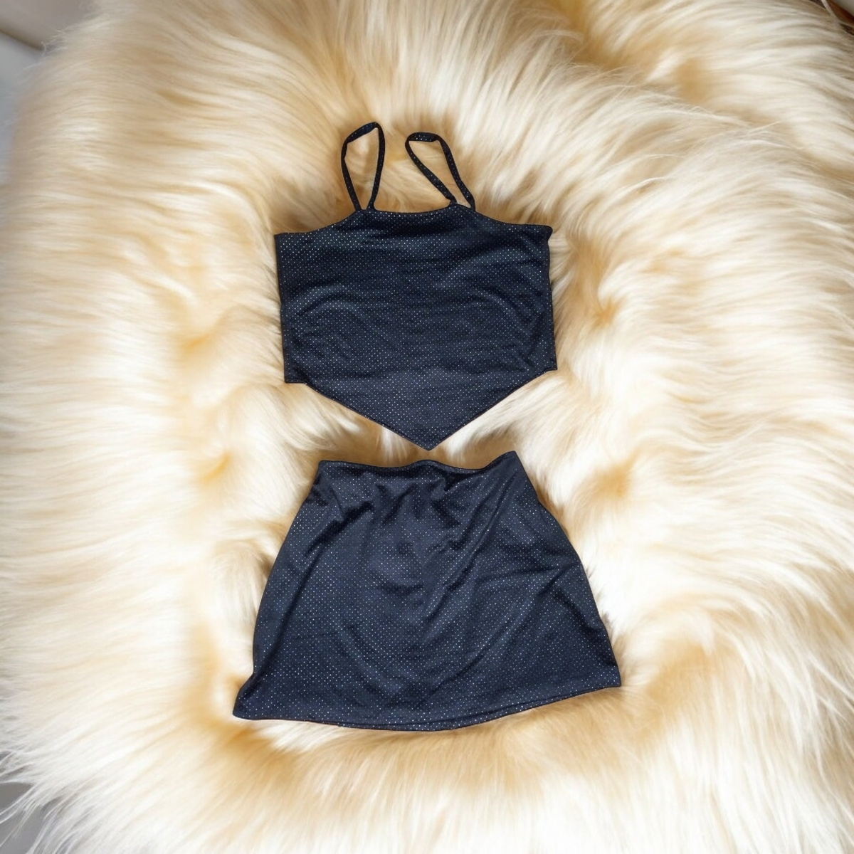 Confeccionada en punto Roma con apliques plateados mil brillos.